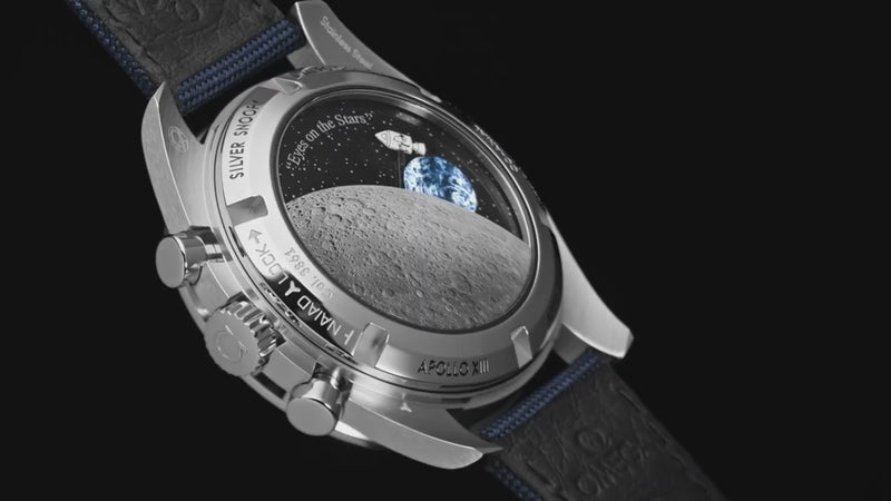 On the NAIAD LOCK caseback, a view of the far side of the Moon has been decorated on the sapphire crystal using a microstructured metallization process. An animated Snoopy in his Command and Service Module (CSM) appears on a magic hand, which rotates when the chronograph function is activated. Behind it, an Earth disc rotates once per minute in tune with the watch's small seconds hand.